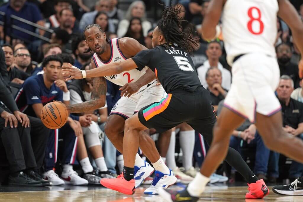 Kawhi Leonard looks to keep the ball moving as San Antonio’s Stephon Castle defends. (Scott Wachter / Imagn Images)