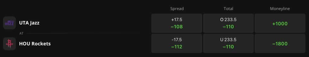 The Rockets enter as 17.5-point favorites on DraftKings Sportsbook, while the Jazz sit as a +1000 underdog. The game total is set at 223.5 points.