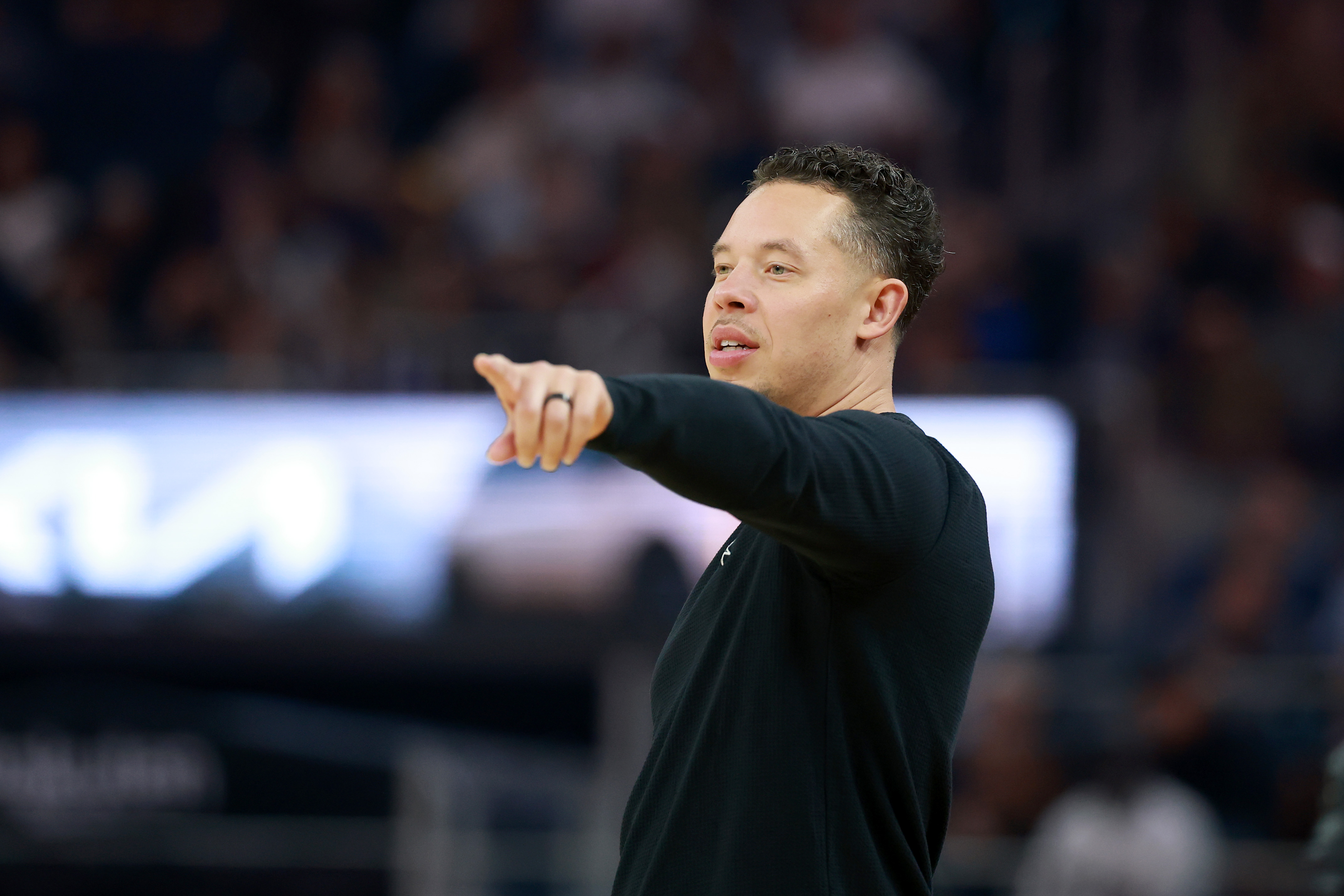GettyHead coach Mitch Johnson of the San Antonio Spurs points to his team during the first half of their game against the Golden State Warriors at Chase Center on April 01, 2026 in San Francisco, California.