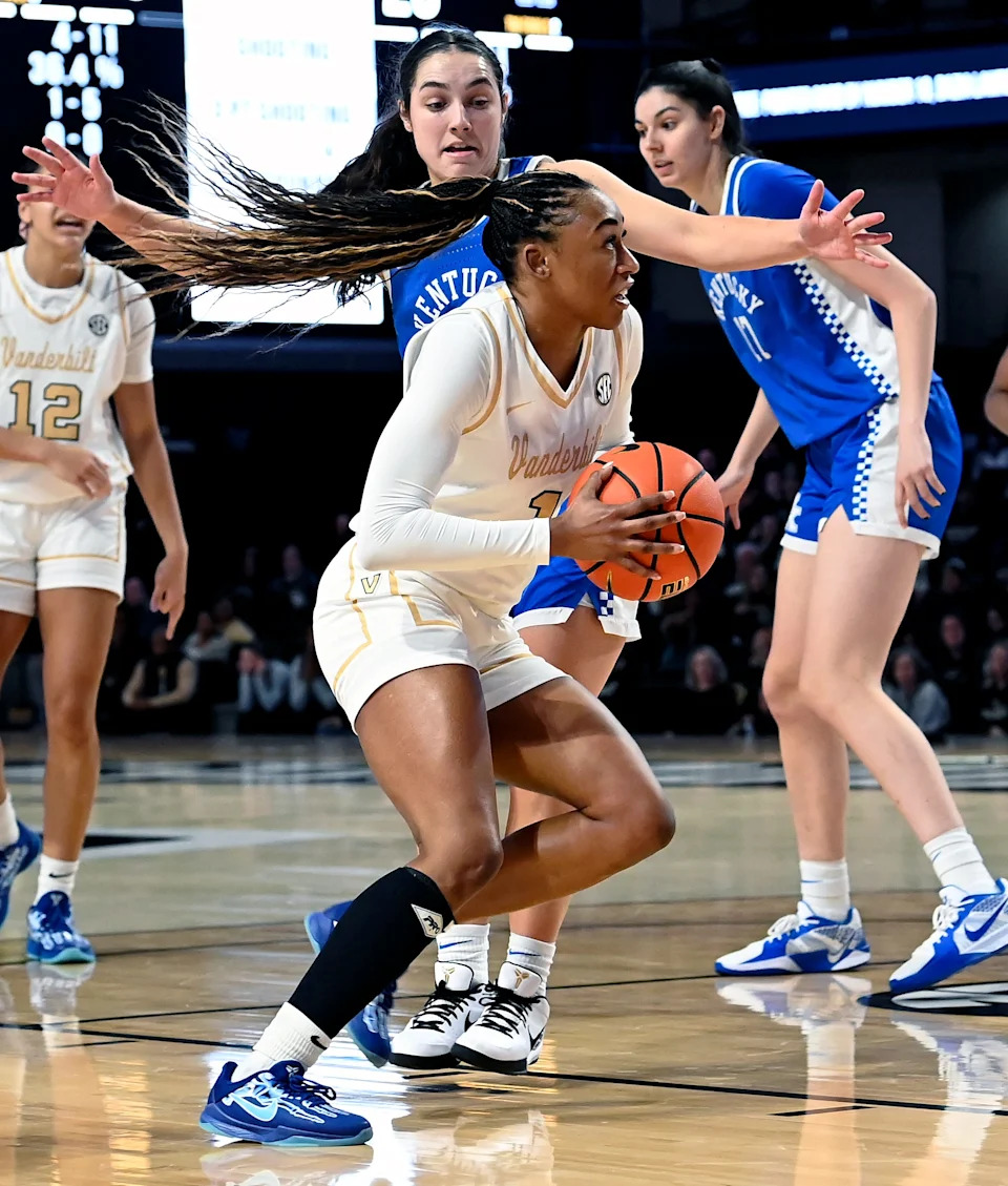 Vanderbilt guard Mikayla Blakes (1) drives to the basket against Kentucky during an NCAA college basketball game Sunday, Jan. 5, 2025, in Nashville, Tenn.