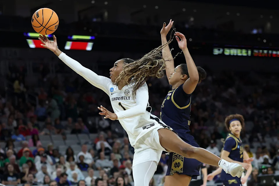 FORT WORTH, TEXAS – MARCH 27: Mikayla Blakes #1 of the Vanderbilt Commodores shoots the ball Cassandre Prosper #8 of the Notre Dame Fighting Irish during the third quarter in the Sweet Sixteen of the 2026 NCAA Women’s Basketball Tournament at Dickies Arena on March 27, 2026 in Fort Worth, Texas. (Photo by Stacy Revere/Getty Images)