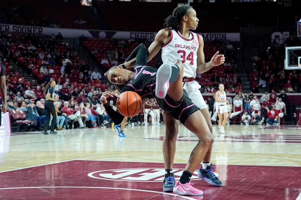 Vanderbilt guard Mikayla Blakes (1) and Oklahoma forward Liz Scott (34) fight for a rebound in the third quarter during an NCAA women’s basketball game between Oklahoma and Vanderbilt at Lloyd Noble Center in Norman, Okla., on Thursday, Feb. 20, 2025.