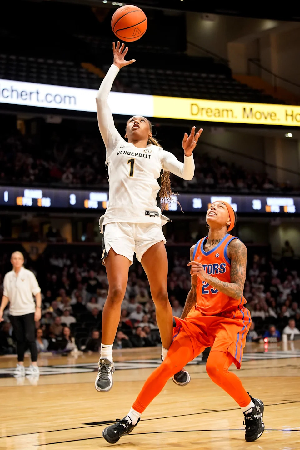 Vanderbilt guard Mikayla Blakes (1) shoots past Florida guard Liv McGill (23) during the third quarter at Memorial Gymnasium in Nashville, Tenn., Sunday, Feb. 1, 2026.