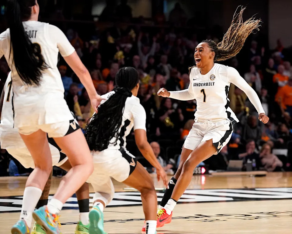 Vanderbilt guard Mikayla Blakes (1) celebrates after defeating Tennessee at Memorial Gym in Nashville, Tenn., Sunday, Jan. 19, 2025.