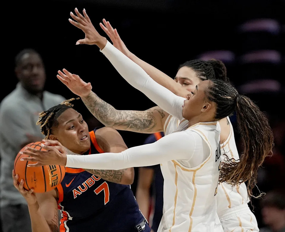 Auburn guard A’riel Jackson (7) looks to pass the ball as Vanderbilt’s Sacha Washington (35) and Mikayla Blakes (1) during the second half of an NCAA college basketball game at Memorial Gymnasium Thursday, Jan. 22, 2026, in Nashville, Tenn. Vanderbilt won 81-53.