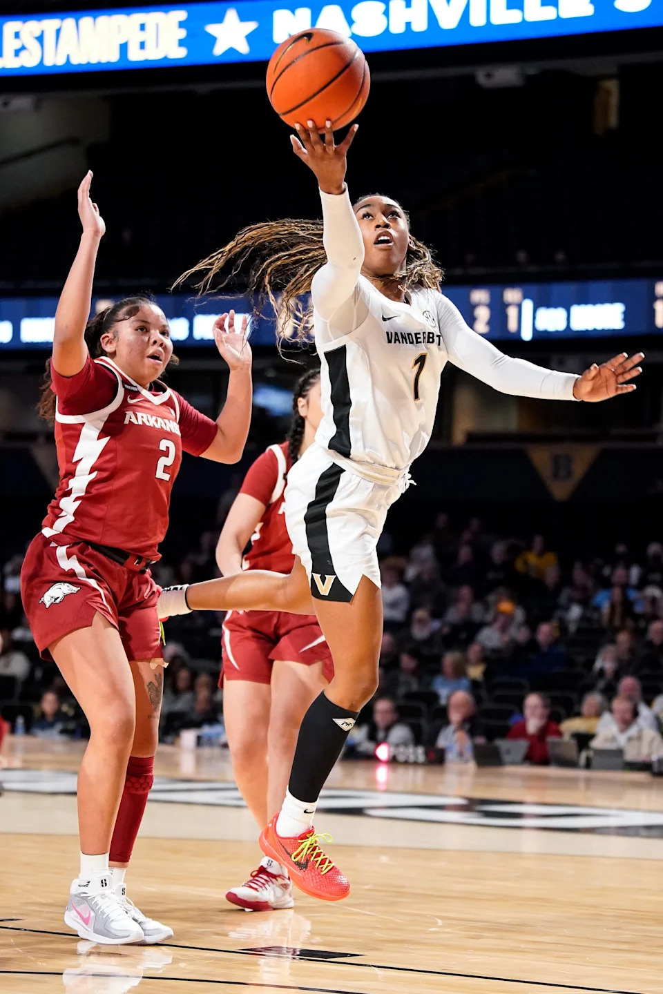 Vanderbilt guard Mikayla Blakes (1) shoots past Arkansas guard Kiki Smith (2) during the second quarter at Memorial Gym in Nashville, Tenn., Thursday, Jan. 23, 2025.