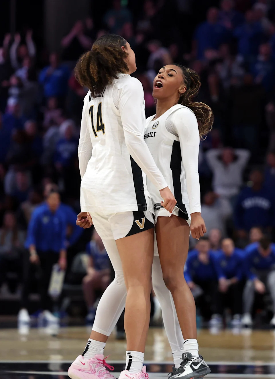Vanderbilt’s Aiyana Mitchell (14) and Vanderbilt’s Mikayla Blakes (1) celebrate their win over Kentucky at Vanderbilt’s Memorial Gym Sunday, Feb. 22, 2026.