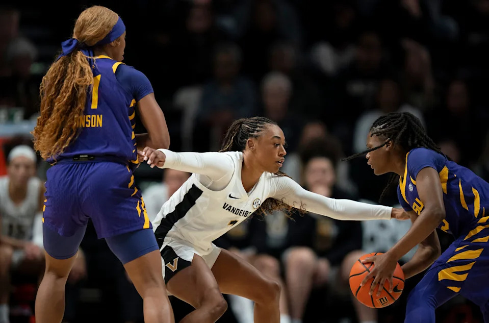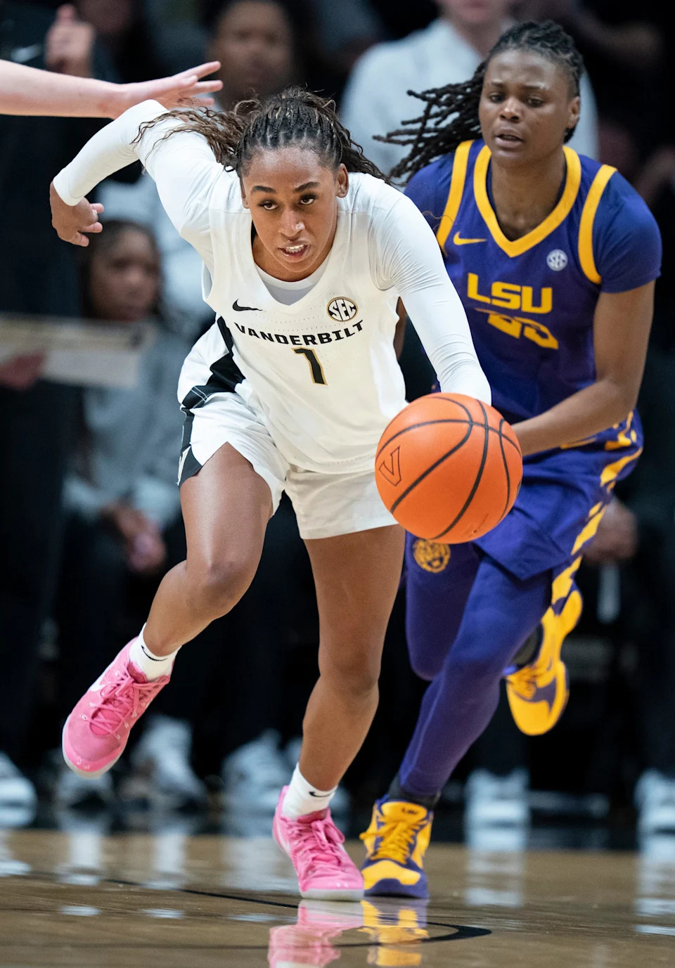 Vanderbilt guard Mikayla Blakes (1) drives away from Louisiana State pressure during their game at Memorial Gymnasium Sunday, Jan. 4, 2026.