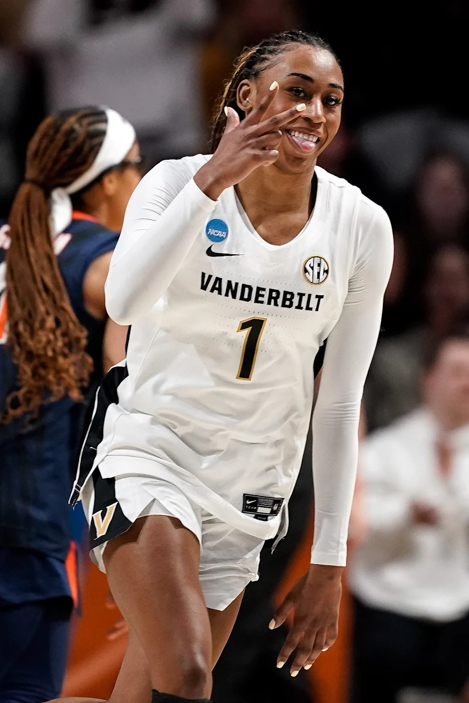 Vanderbilt guard Mikayla Blakes (1) celebrates a three point shot against Illinois during the second half of a second round NCAA college basketball tournament game at Memorial Gym in Nashville, Tenn., Monday, March 23, 2026.