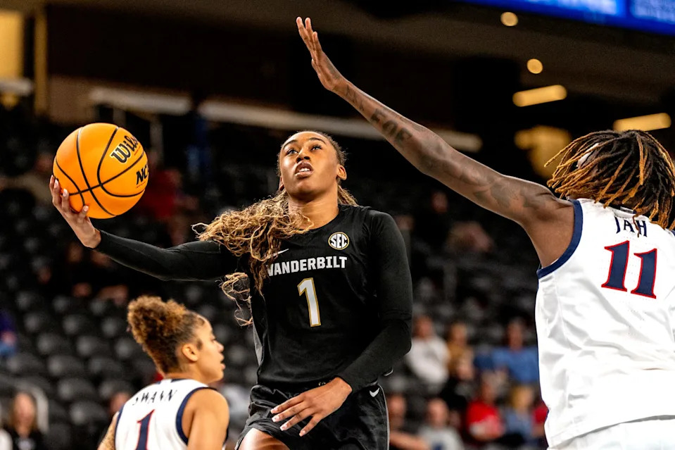 Vanderbilt guard Mikayla Blakes (1) shoots against Arizona at Acrisure Arena in Palm Desert, Calif., on Tuesday, November 26, 2024.