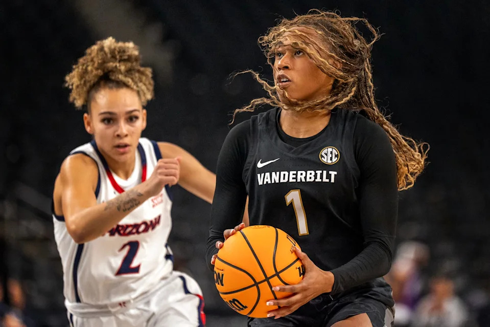 Vanderbilt guard Mikayla Blakes (1) looks to shoot as Arizona guard Jada Williams (2) defends at Acrisure Arena in Palm Desert, Calif., on Tuesday, November 26, 2024.