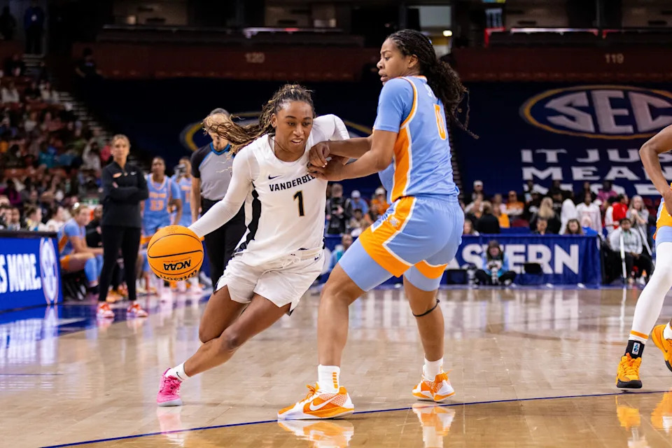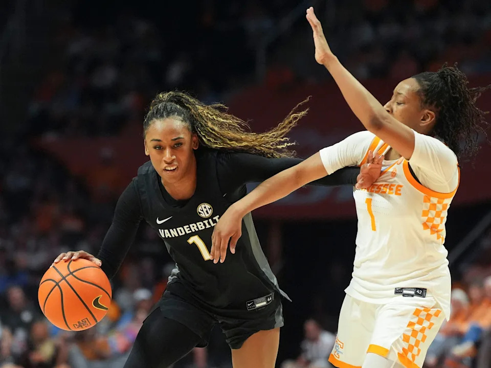 Vanderbilt guard Mikayla Blakes (1) moves the ball while guarded by Tennessee guard Nya Robertson (1) during an NCAA college basketball game on March 1, 2026 in Knoxville, Tennessee.