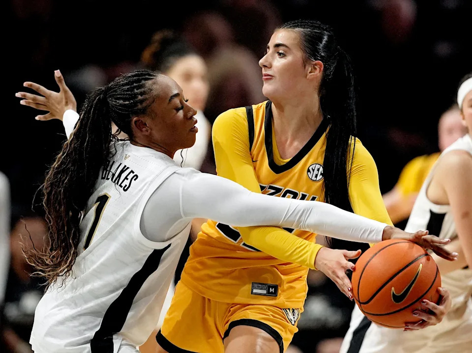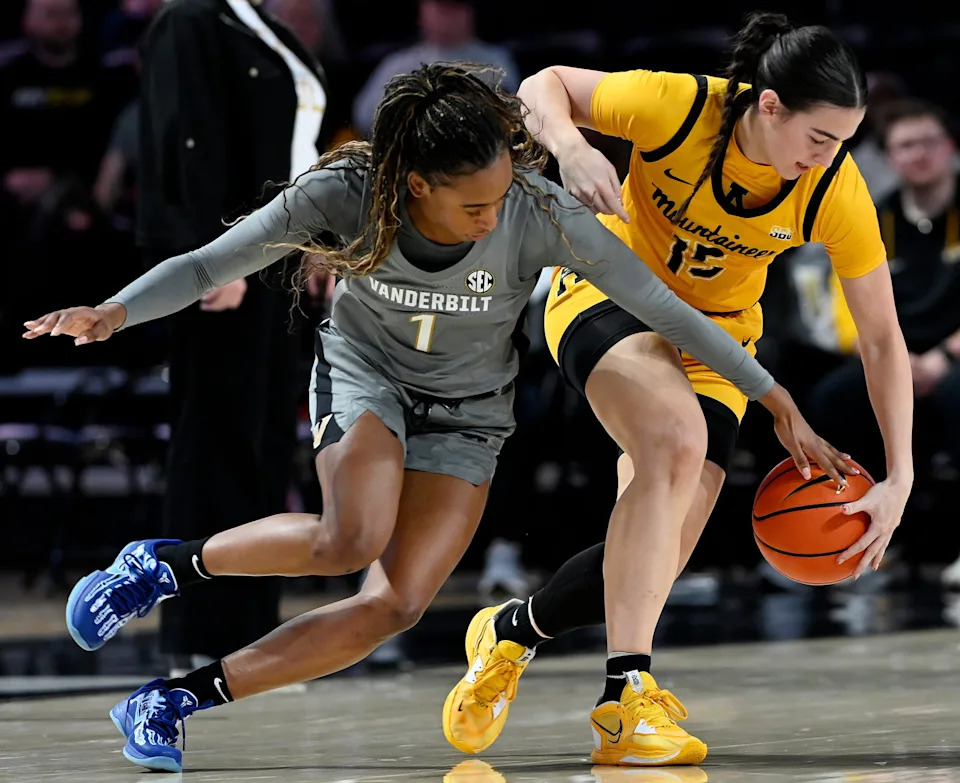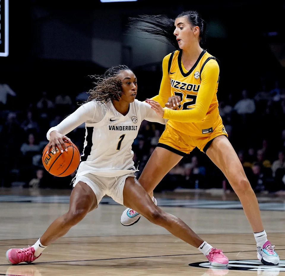 Missouri guard Chloe Sotell (22) is defended by Vanderbilt guard Mikayla Blakes (1) during the first half of an NCAA college basketball game at Memorial Gymnasium Thursday, Jan. 8, 2026, in Nashville, Tenn.