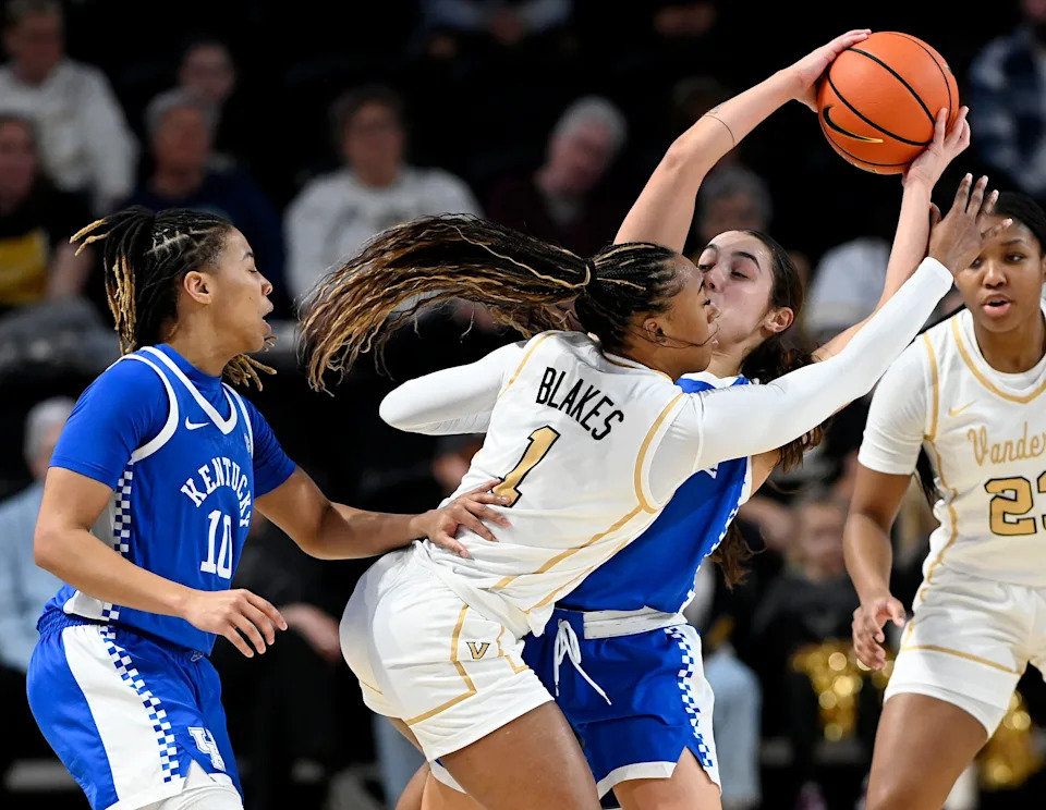 Vanderbilt guard Mikayla Blakes (1) tries to knock the ball away from Kentucky’s Georgia Amoore (3) as Dazia Lawrence (10) helps put during an NCAA college basketball game Sunday, Jan. 5, 2025, in Nashville, Tenn.