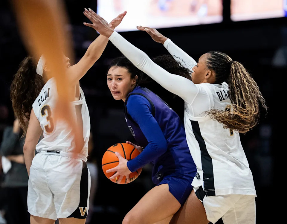 Virginia Cavaliers guard Jillian Brown (4) guards Vanderbilt Commodores guard Mikayla Blakes (1) as Virginia Cavaliers forward Caitlin Weimar (12) also guards during the women’s basketball game between the Vanderbilt Commodores and Virginia Cavaliers at Vanderbilt’s Memorial Gymnasium in Nashville on Wednesday, Dec. 3, 2025.