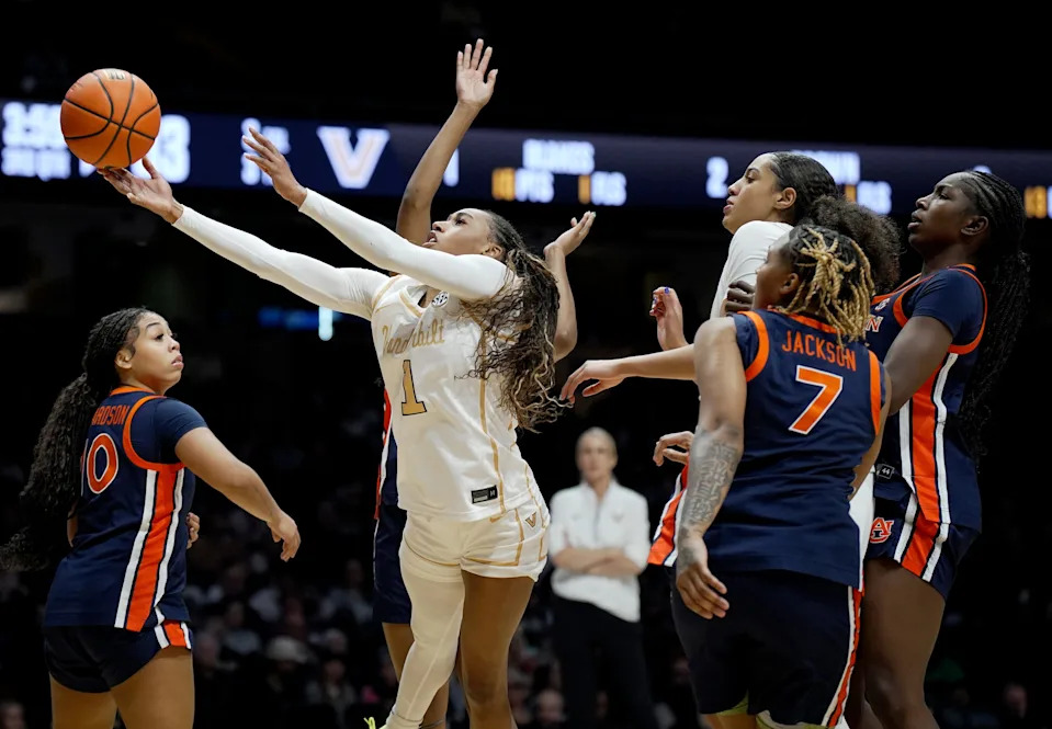 Vanderbilt guard Mikayla Blakes (1) drives to the basket against Auburn during the second half of an NCAA college basketball game at Memorial Gymnasium Thursday, Jan. 22, 2026, in Nashville, Tenn. Vanderbilt won 81-53.