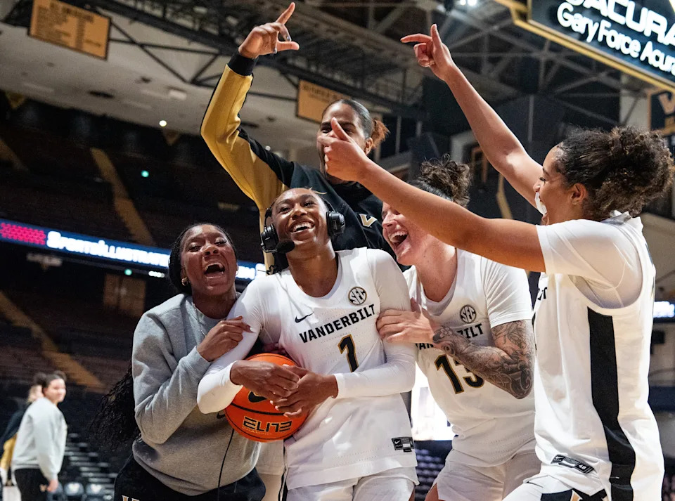 Vanderbilt Commodores guard Mikayla Blakes (1) celebrates with her teammates after the women’s basketball game between the Vanderbilt Commodores and Virginia Cavaliers at Vanderbilt’s Memorial Gymnasium in Nashville on Wednesday, Dec. 3, 2025.