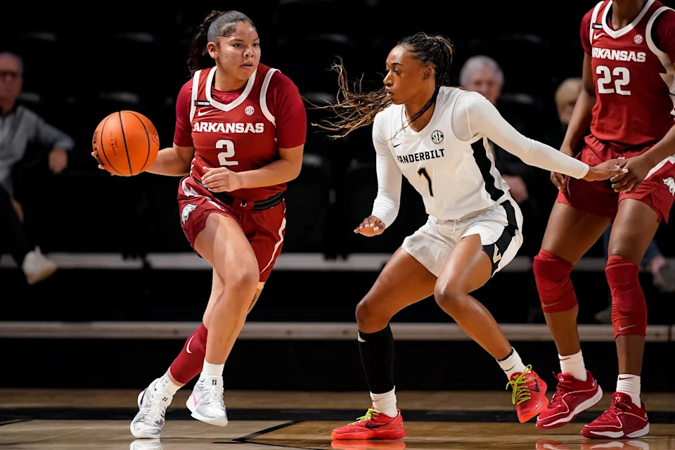Arkansas guard Kiki Smith (2) looks for a path past Vanderbilt guard Mikayla Blakes (1) during the first quarter at Memorial Gym in Nashville, Tenn., Thursday, Jan. 23, 2025.