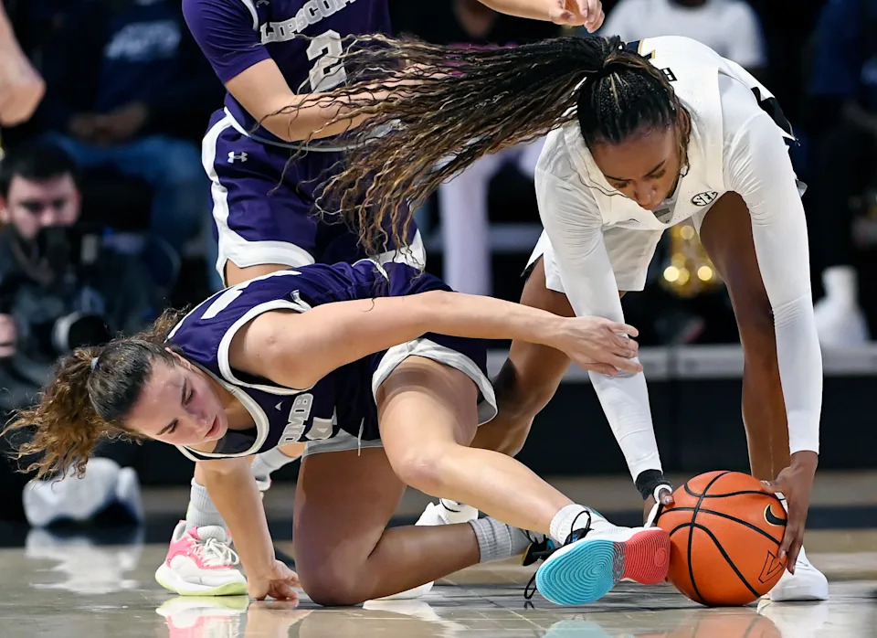 Vanderbilt’s Mikayla Blakes (1) and Mississippi State forward Quanirah Montague, left, scramble for the ball in double overtime during an NCAA college basketball game Thursday, Feb. 13, 2025, in Nashville, Tenn.