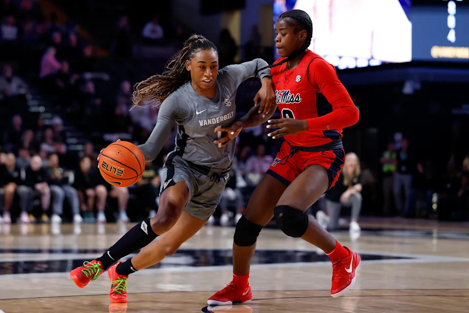 NASHVILLE, TENNESSEE – FEBRUARY 02: Mikayla Blakes #1 of the Vanderbilt Commodores dribbles the ball past Sira Thienou #0 of the Ole Miss Rebels during the first half at Vanderbilt University Memorial Gymnasium on February 02, 2025 in Nashville, Tennessee. (Photo by Johnnie Izquierdo/Getty Images)