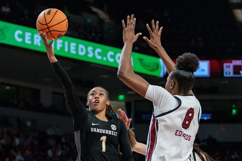 COLUMBIA, SOUTH CAROLINA – JANUARY 25: Mikayla Blakes #1 of the Vanderbilt Commodores drives to the basket while guarded by Joyce Edwards #8 of the South Carolina Gamecocks in the second half during their game at Colonial Life Arena on January 25, 2026 in Columbia, South Carolina. (Photo by Jacob Kupferman/Getty Images)