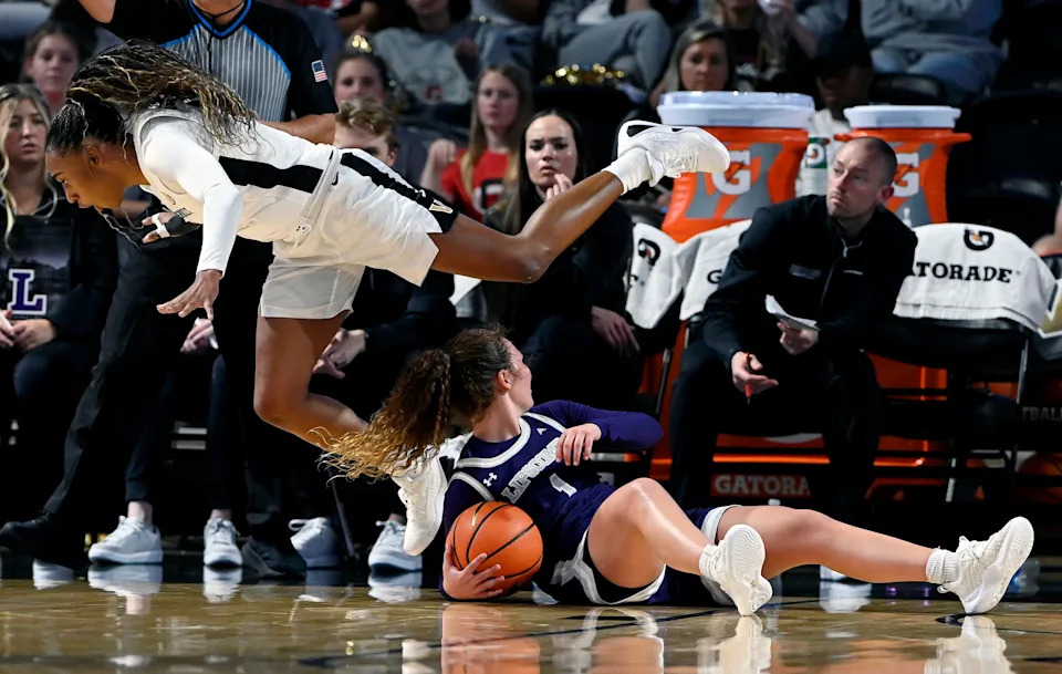 Vanderbilt guard Mikayla Blakes (1) falls over Lipscomb guard Claira McGowan (1) going for the ball during an NCAA college basketball game Monday, Nov. 4, 2024, in Nashville, Tenn.