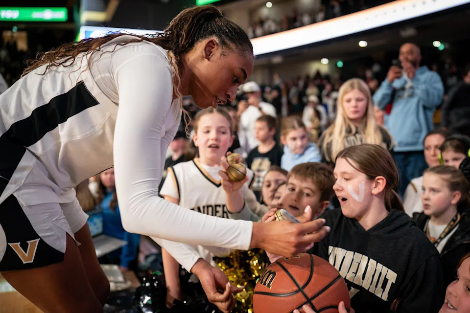 Vanderbilt guard Mikayla Blakes (1) sings autographs after defeating Florida at Memorial Gymnasium in Nashville, Tenn., Sunday, Feb. 1, 2026.