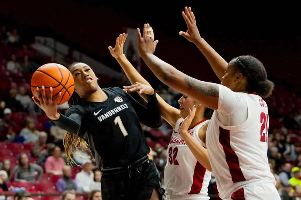 Vanderbilt guard Mikayla Blakes (1) attempts to score as Alabama guard Aaliyah Nye (32) and Alabama forward Essence Cody (21) attempt to block her at Coleman Coliseum Sunday, Jan. 26, 2025.
