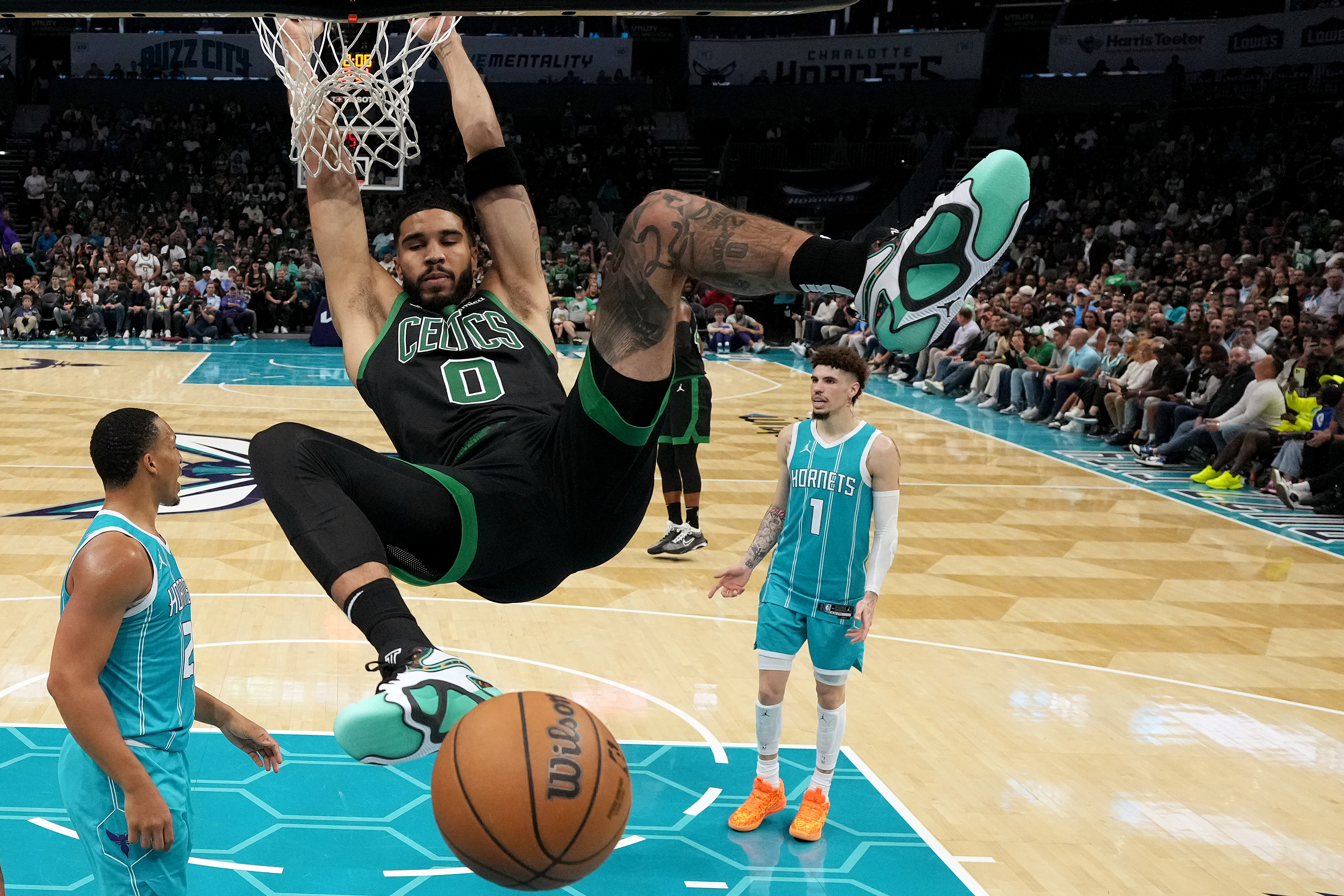 GettyJayson Tatum #0 of the Boston Celtics dunks against the Charlotte Hornets during the second half of the game at Spectrum Center on November 02, 2024 in Charlotte, North Carolina.