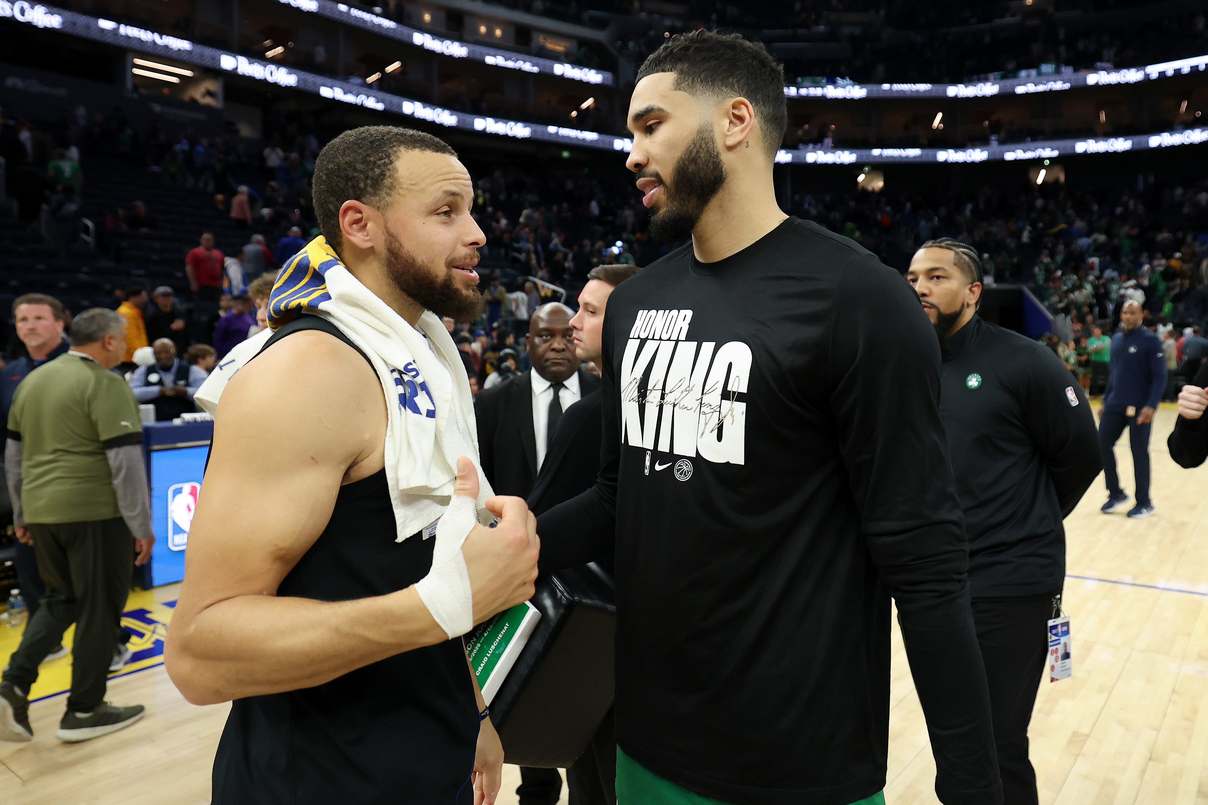 GettyStephen Curry #30 of the Golden State Warriors talks with Jayson Tatum #0 of the Boston Celtics after their game at Chase Center on January 20, 2025 in San Francisco, California.
