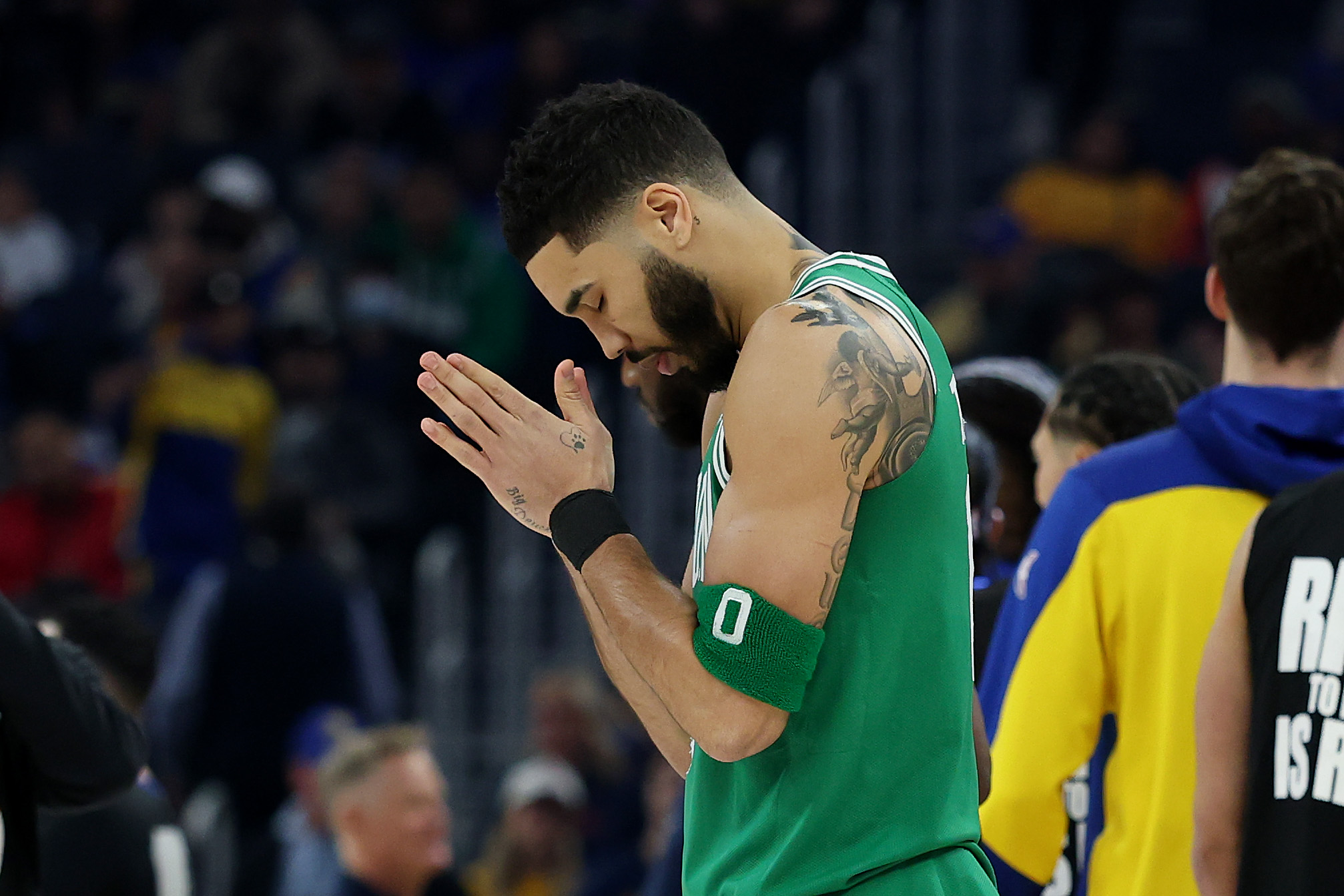 GettyJANUARY 20: Jayson Tatum #0 of the Boston Celtics takes a moment before their game against the Golden State Warriors at Chase Center on January 20, 2025 in San Francisco, California.