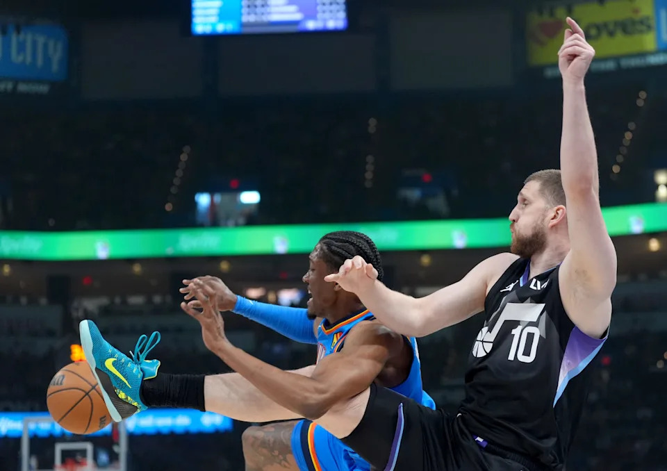 during the NBA basketball game between the Oklahoma City Thunder and the Utah Jazz at Paycom Center in Oklahoma City, Sunday April 5, 2026.