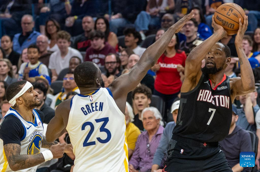 Kevin Durant (L) of Houston Rockets controls the ball against De’Anthony Melton (C) and Draymond Green of Golden State Warriors during the 2025-2026 NBA regular season basketball game between Houston Rockets and Golden State Warriors in San Francisco, the United States, April 5, 2026. (Photo by Arthur Dong/Xinhua)