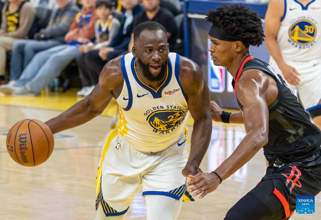 Draymond Green (L) of Golden State Warriors breaks through against Amen Thompson of Houston Rockets during the 2025-2026 NBA regular season basketball game between Houston Rockets and Golden State Warriors in San Francisco, the United States, April 5, 2026. (Photo by Arthur Dong/Xinhua)