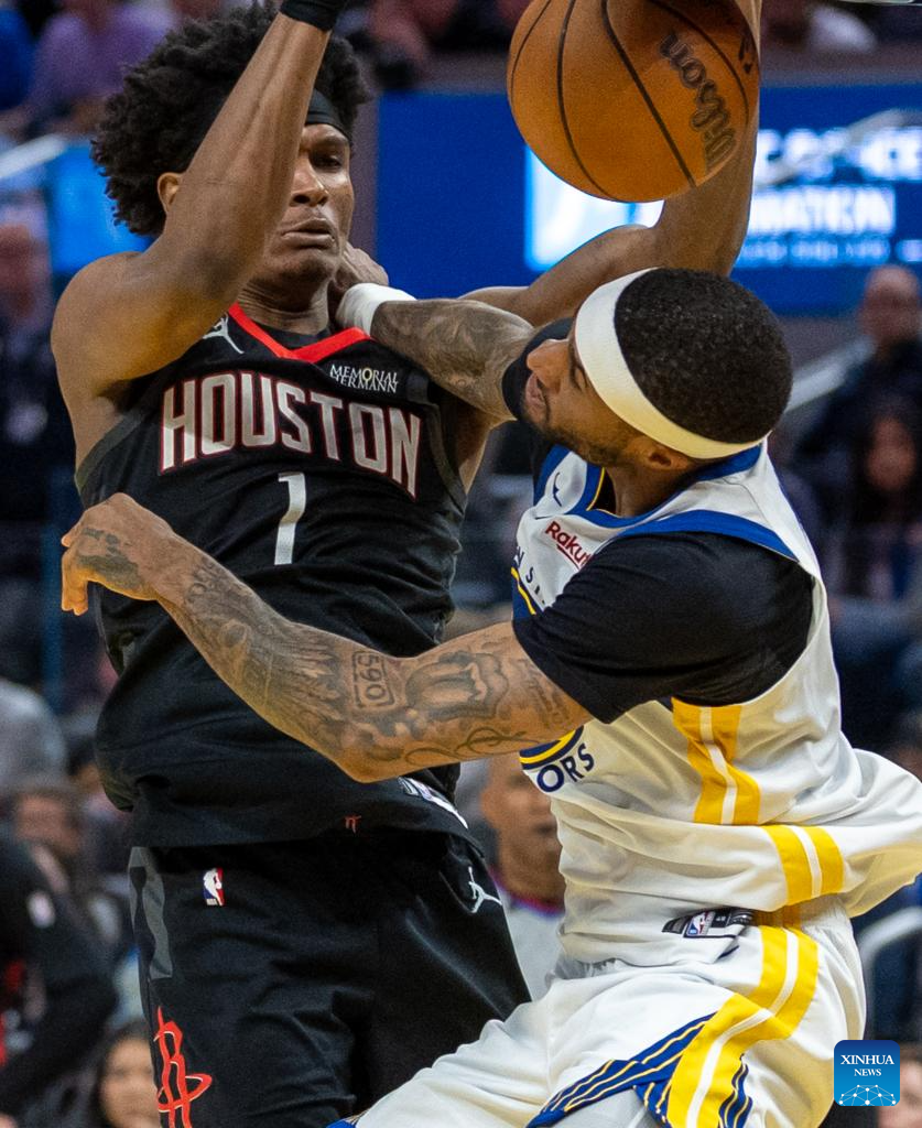 Amen Thompson (L) of Houston Rockets breaks through during the 2025-2026 NBA regular season basketball game between Houston Rockets and Golden State Warriors in San Francisco, the United States, April 5, 2026. (Photo by Arthur Dong/Xinhua)