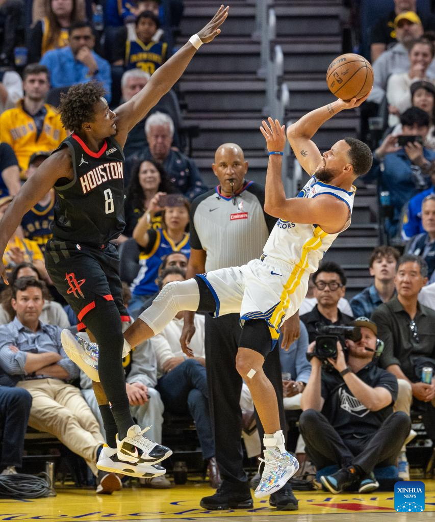Stephen Curry (R) of Golden State Warriors shoots against Jae’Sean Tate of Houston Rockets during the 2025-2026 NBA regular season basketball game between Houston Rockets and Golden State Warriors in San Francisco, the United States, April 5, 2026. (Photo by Arthur Dong/Xinhua)