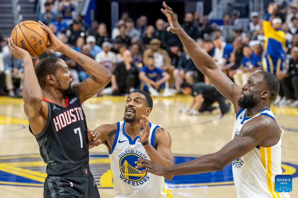 Kevin Durant (R) of Houston Rockets controls the ball against Draymond Green (C) and Gary Payton II of Golden State Warriors during the 2025-2026 NBA regular season basketball game between Houston Rockets and Golden State Warriors in San Francisco, the United States, April 5, 2026. (Photo by Arthur Dong/Xinhua)