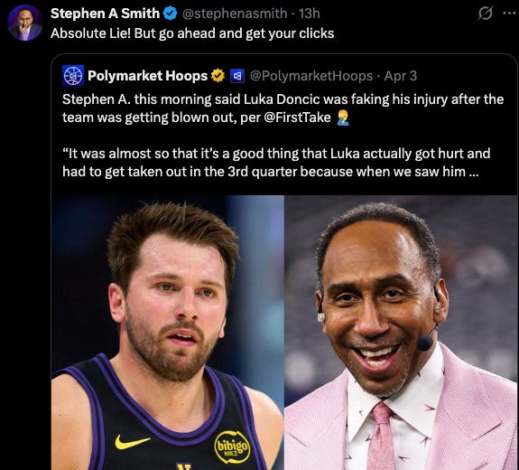 Case in point: after Luka Doncic injured his hamstring vs. the Thunder, Stephen A. went on TV to say it was actually a good thing he was legitimately hurt because everyone thinks he just fakes injuries when he’s not playing well.