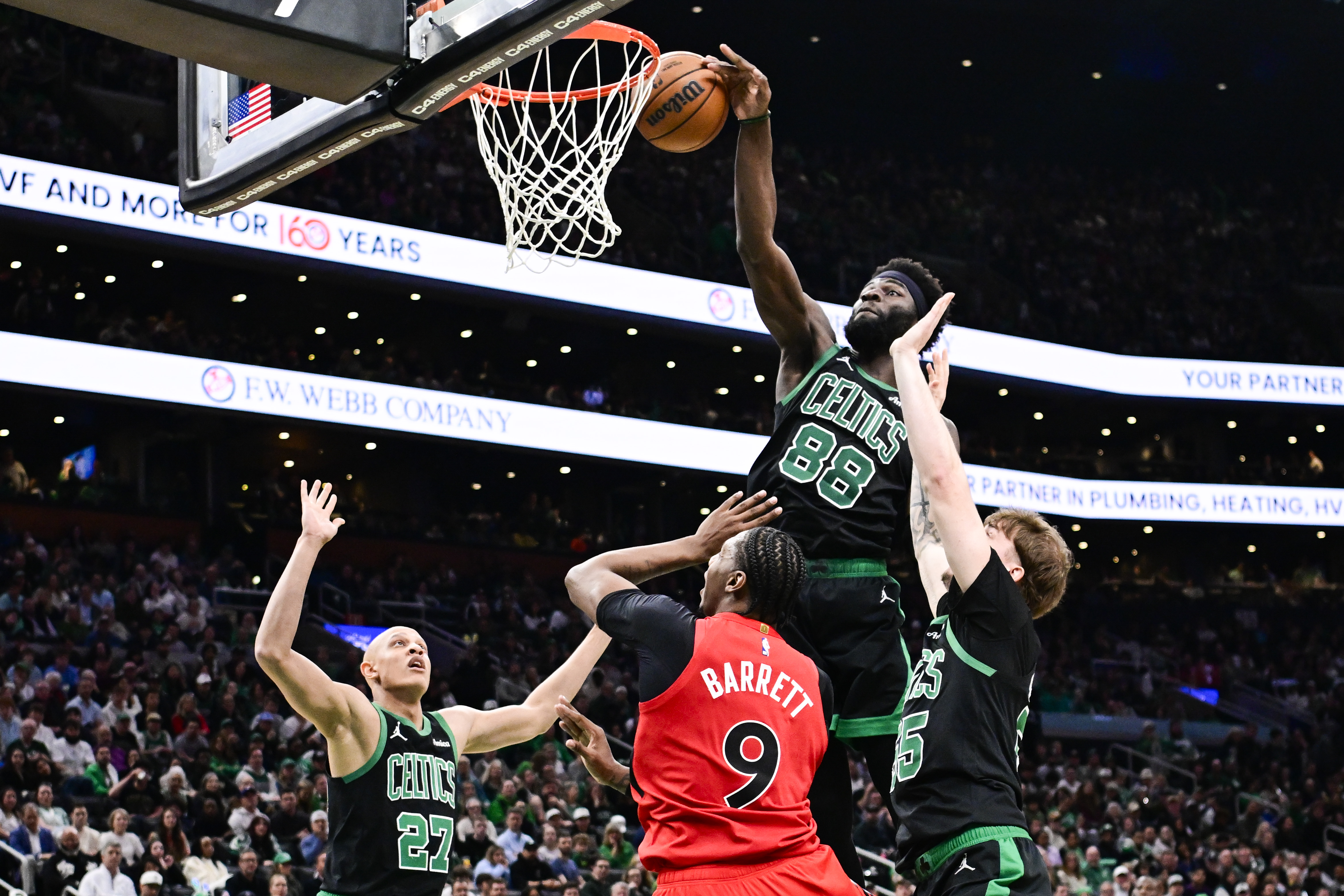 GettyBOSTON, MASSACHUSETTS – APRIL 05: Neemias Queta #88 of the Boston Celtics blocks a shot attempt made by RJ Barrett #9 of the Toronto Raptors during the second half at TD Garden on April 05, 2026 in Boston, Massachusetts. (Photo by Jaiden Tripi/Getty Images)