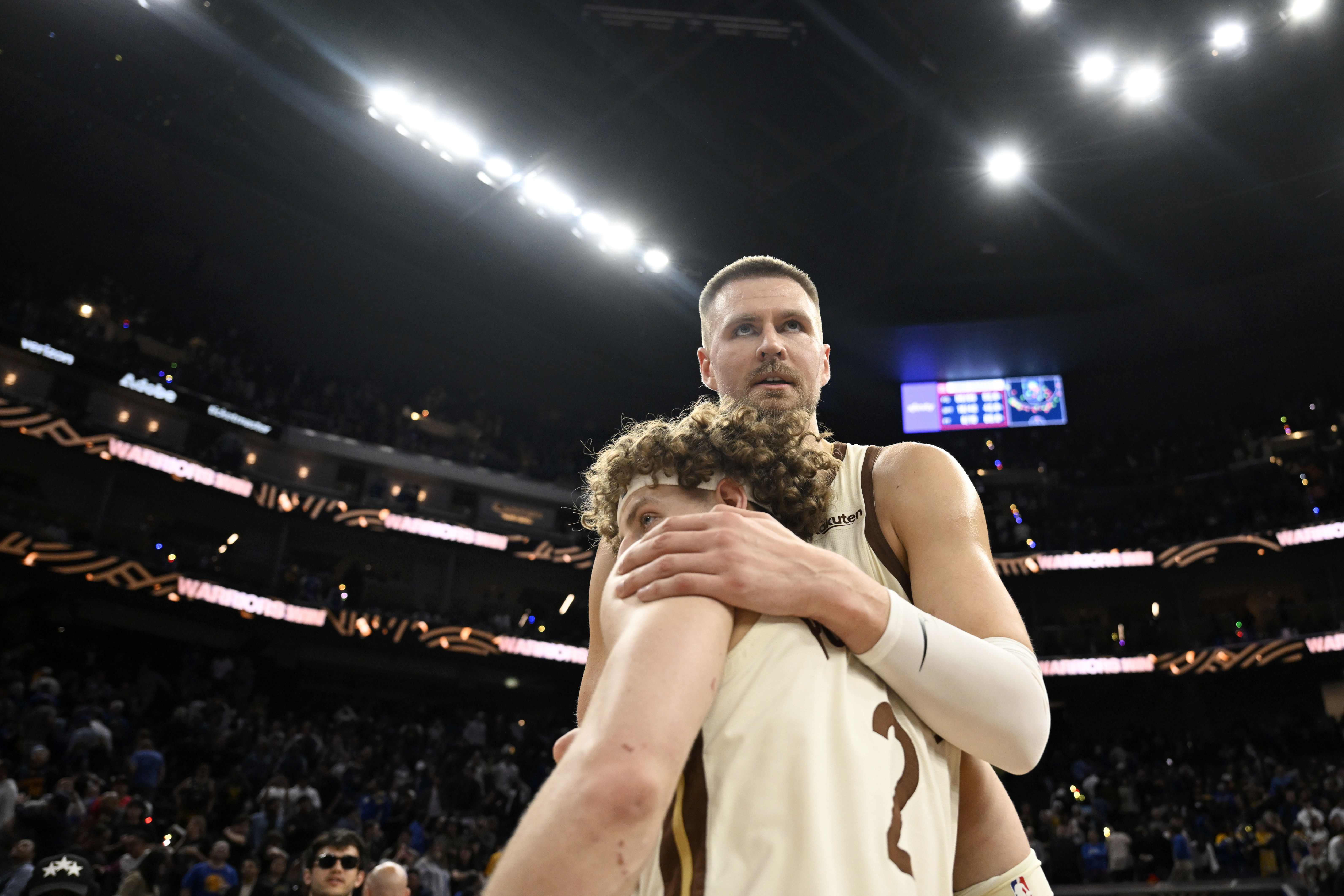 GettyBrandin Podziemski #2 of the Golden State Warriors hugs Kristaps Porzingis #7 after the game against the Washington Wizards at Chase Center on March 27, 2026 in San Francisco, California.