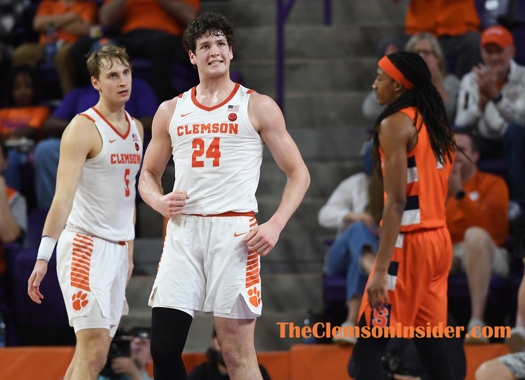 Clemson forward PJ Hall reacts after blocking the shot of Syracuse forward Chris Bell on Wednesday, February 22, 2023 at Littlejohn Coliseum in Clemson, S.C. (Bart Boatwright/The Clemson Insider)