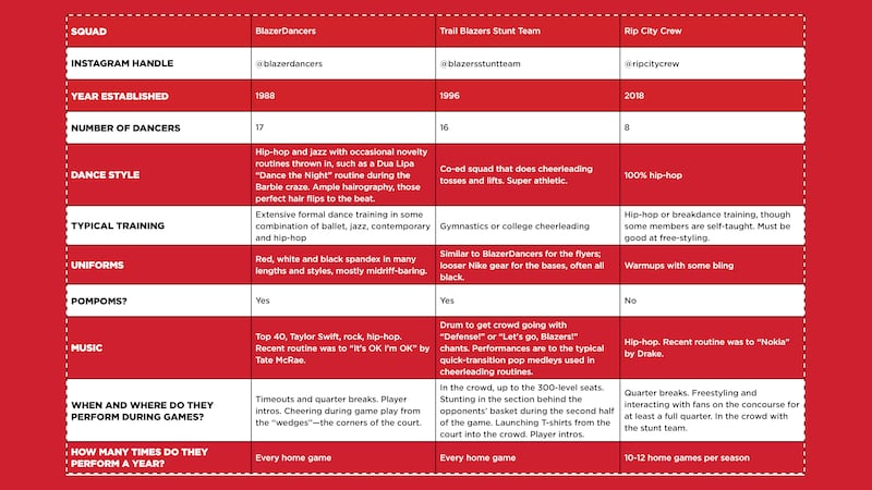 But even for a dance fan with a moderately trained eye, all of the performances during a Blazer game can be confusing. There are three separate dance squads affiliated with the Trail Blazers, all with their own styles, uniforms and dancers. There are many commonalities, though: All three squads are technically co-ed, though the Stunt Team has the most fellas since every “flyer” needs a “base.” Dancers are as young as 18 years old, all the way up through their 30s; a typical dance lifespan is three to five years on a squad, according to Burch.