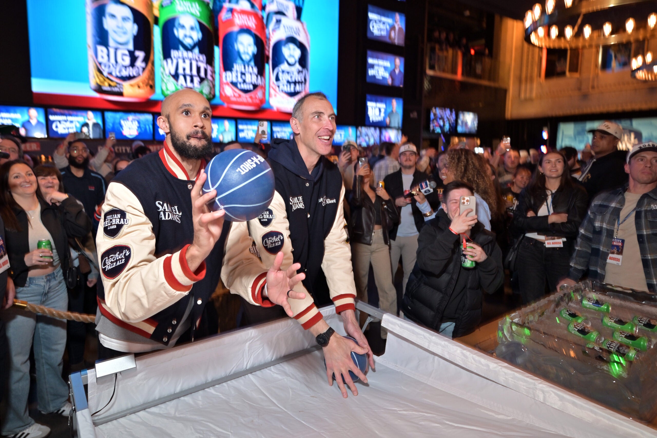 Derrick White battled Zdeno Chara in Pop-A-Shot on Saturday at Banners. (Josh Reynolds/AP Content Services for Sam Adams)