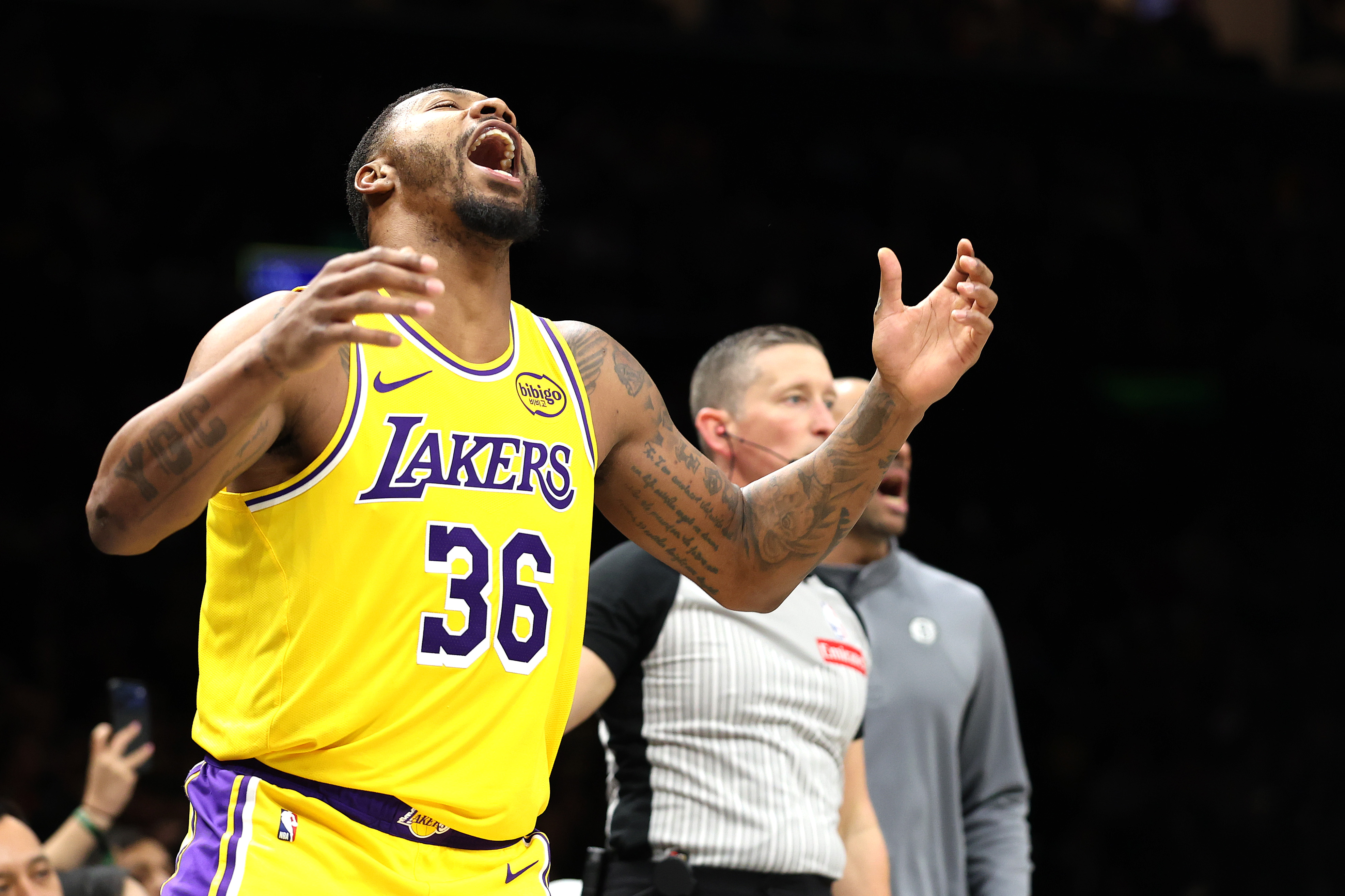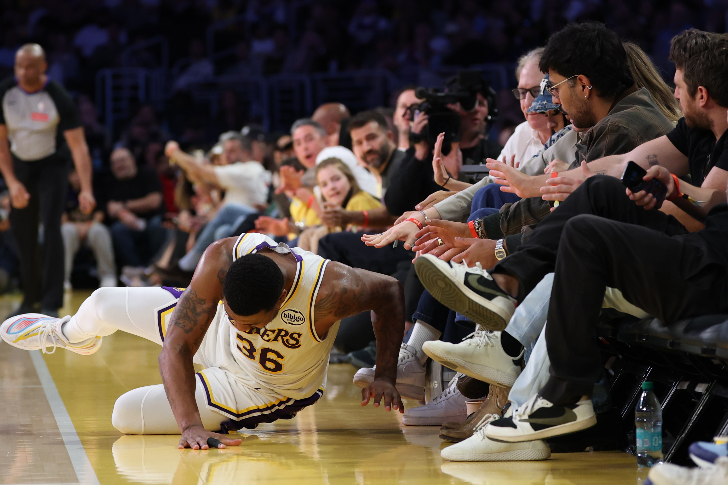 GettyLos Angeles Lakers guard Marcus Smart (36) tries to save a loose ball during second half action against the New York Knicks at Crypto.com Arena.
