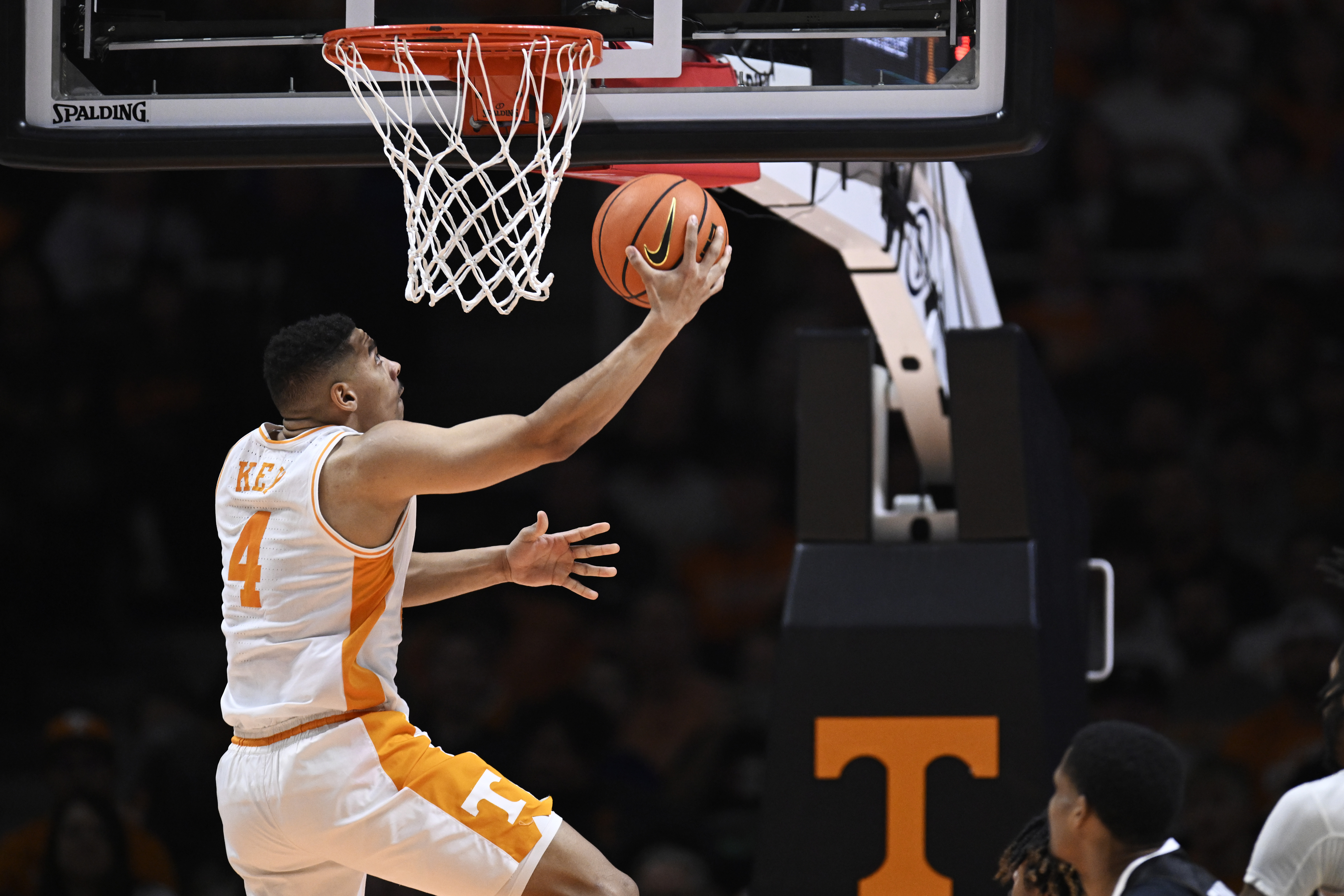 GettyTyreke Key #4 of the Tennessee Volunteers goes for two against the Austin Peay Governors in the first half at Thompson-Boling Arena on December 21, 2022 in Knoxville, Tennessee.