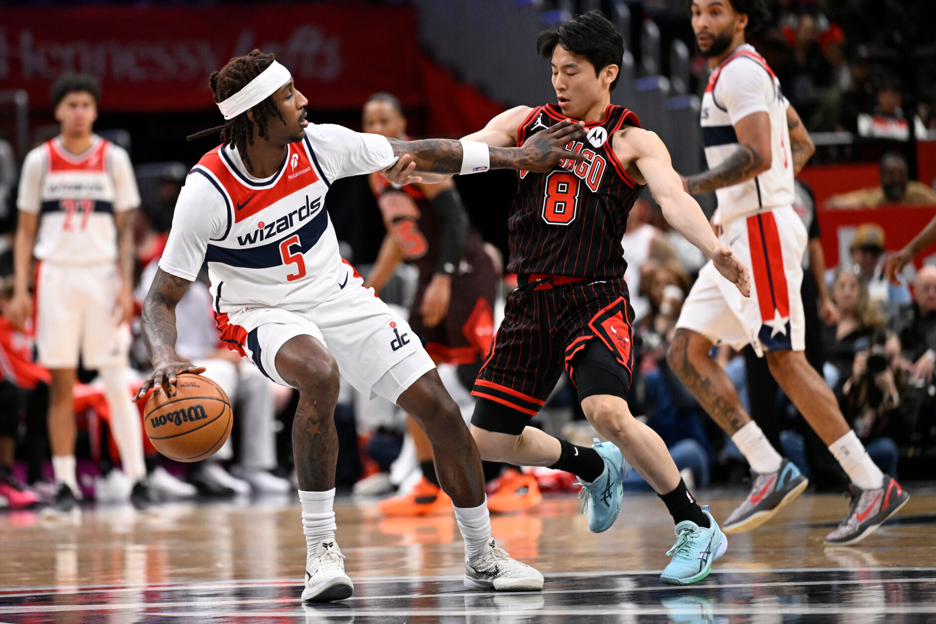 Bulls Wizards Basketball Washington Wizards guard Jamir Watkins (5) stiff arms Chicago Bulls guard Yuki Kawamura during the first half of an NBA basketball game, Tuesday, April 7, 2026, in Washington. (AP Photo/John McDonnell)