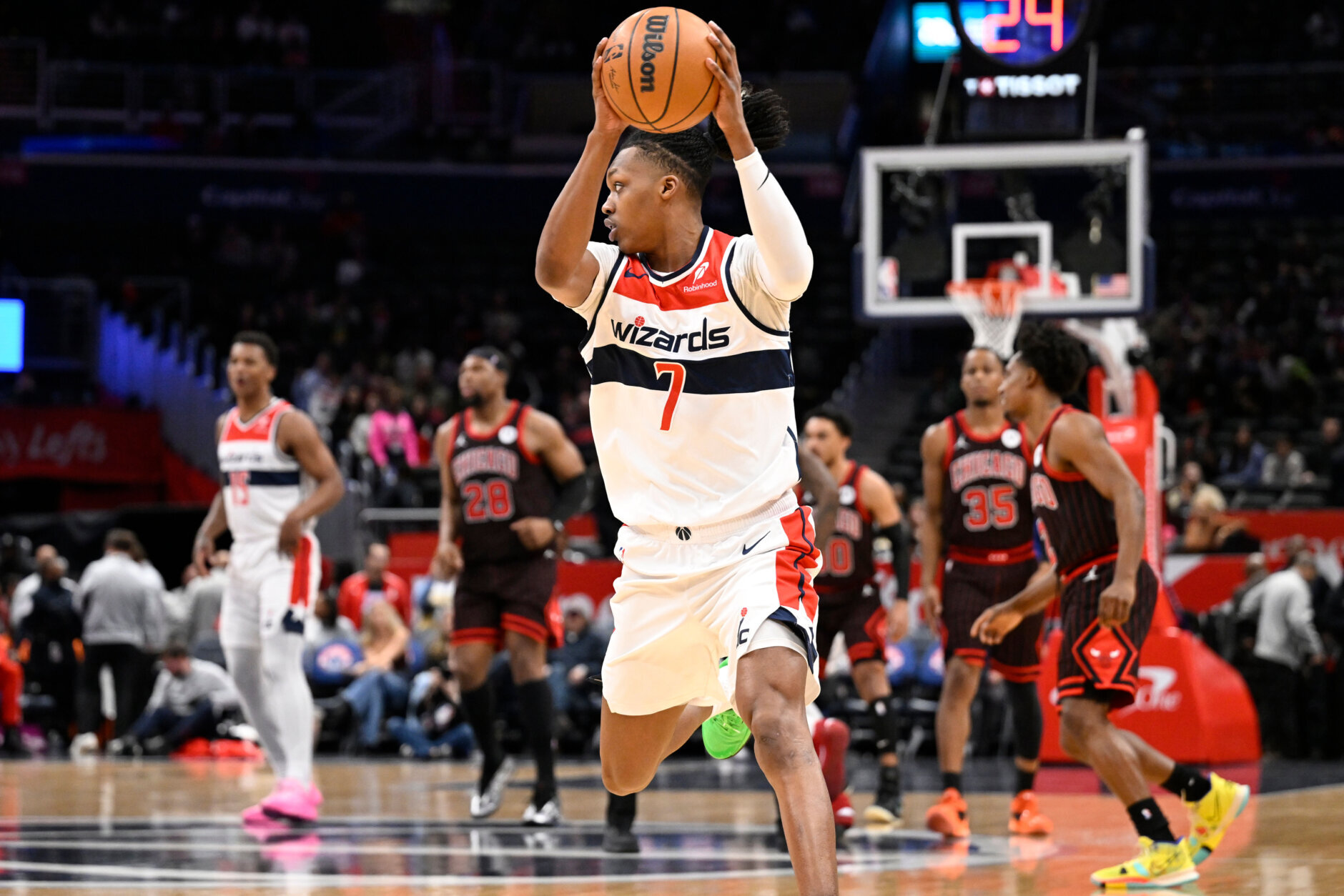 Bulls Wizards Basketball Washington Wizards guard Bub Carrington (7) gathers a loose ball during the first half of an NBA basketball game against the Chicago Bulls, Tuesday, April 7, 2026, in Washington. (AP Photo/John McDonnell)