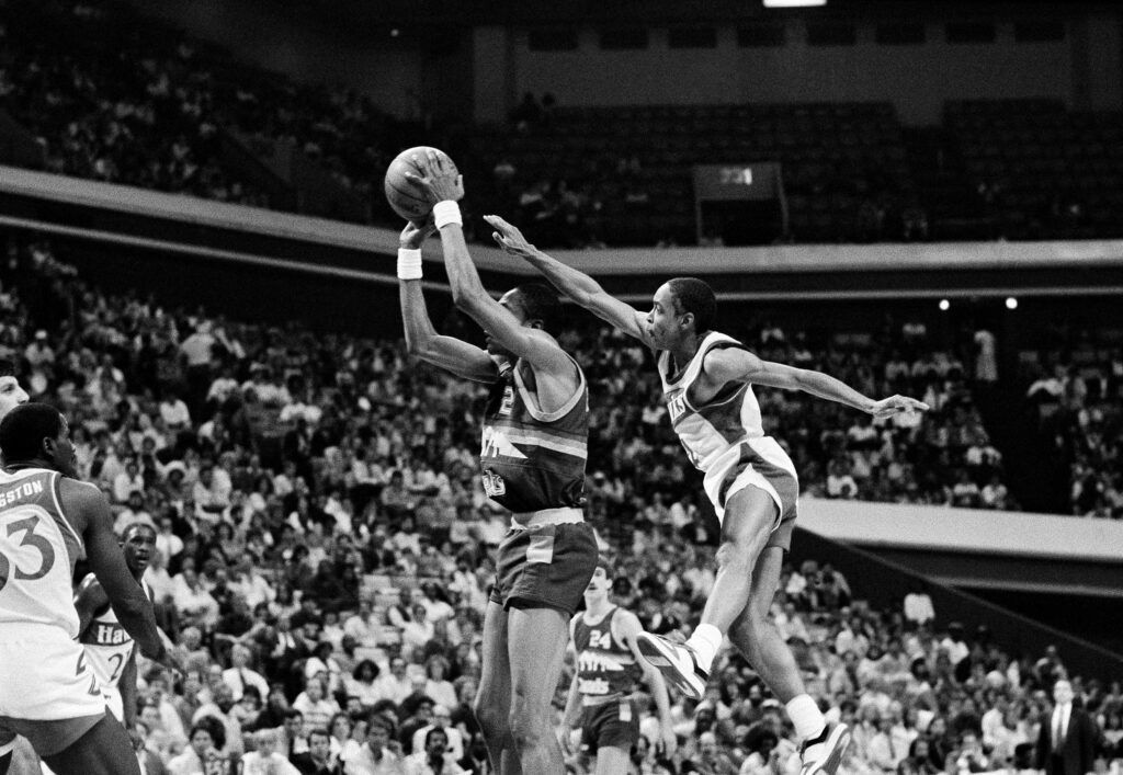 Atlanta Hawks’ Spud Webb (4) sails up and almost over Denver Nuggets’ Alex English (2) as he tries for two points in the first period of their NBA game, March 11, 1986, in Atlanta’s Omni. (AP Photo/Joe Holloway, Jr.)