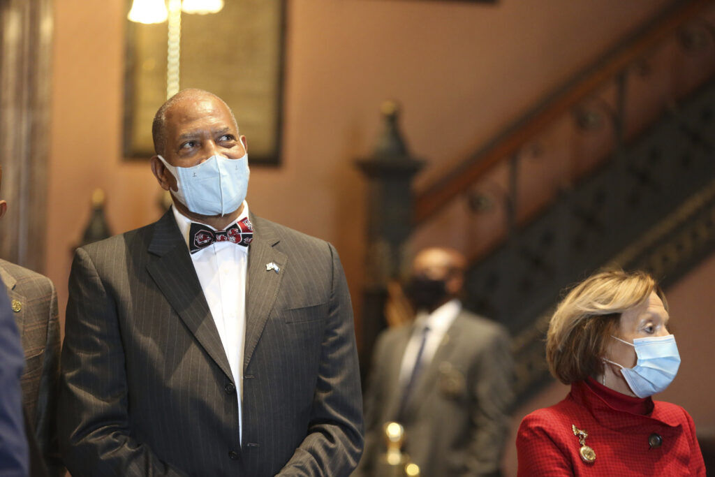 University of South Carolina trustee Alex English watches a broadcast of legislators voting to keep him on the school’s board on March 3, 2021, in Columbia, S.C. The former basketball star’s election was a rare win for diversity in an overwhelmingly Republican state. (AP Photo/Jeffrey Collins)