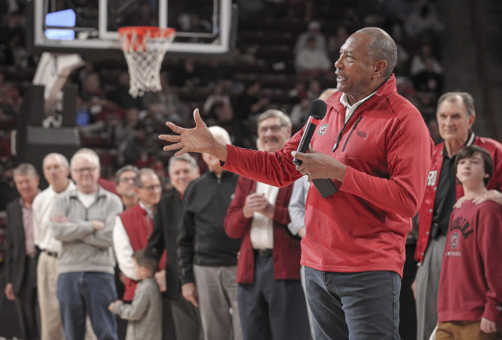 Former University of South Carolina and Denver Nuggets star Alex English talks to the crowd in Columbia, S.C., on Feb. 4, 2023, during halftime of South Carolina’s game during Legends Weekend against Arkansas. (Photo by Travis Bell/Sideline Carolina)